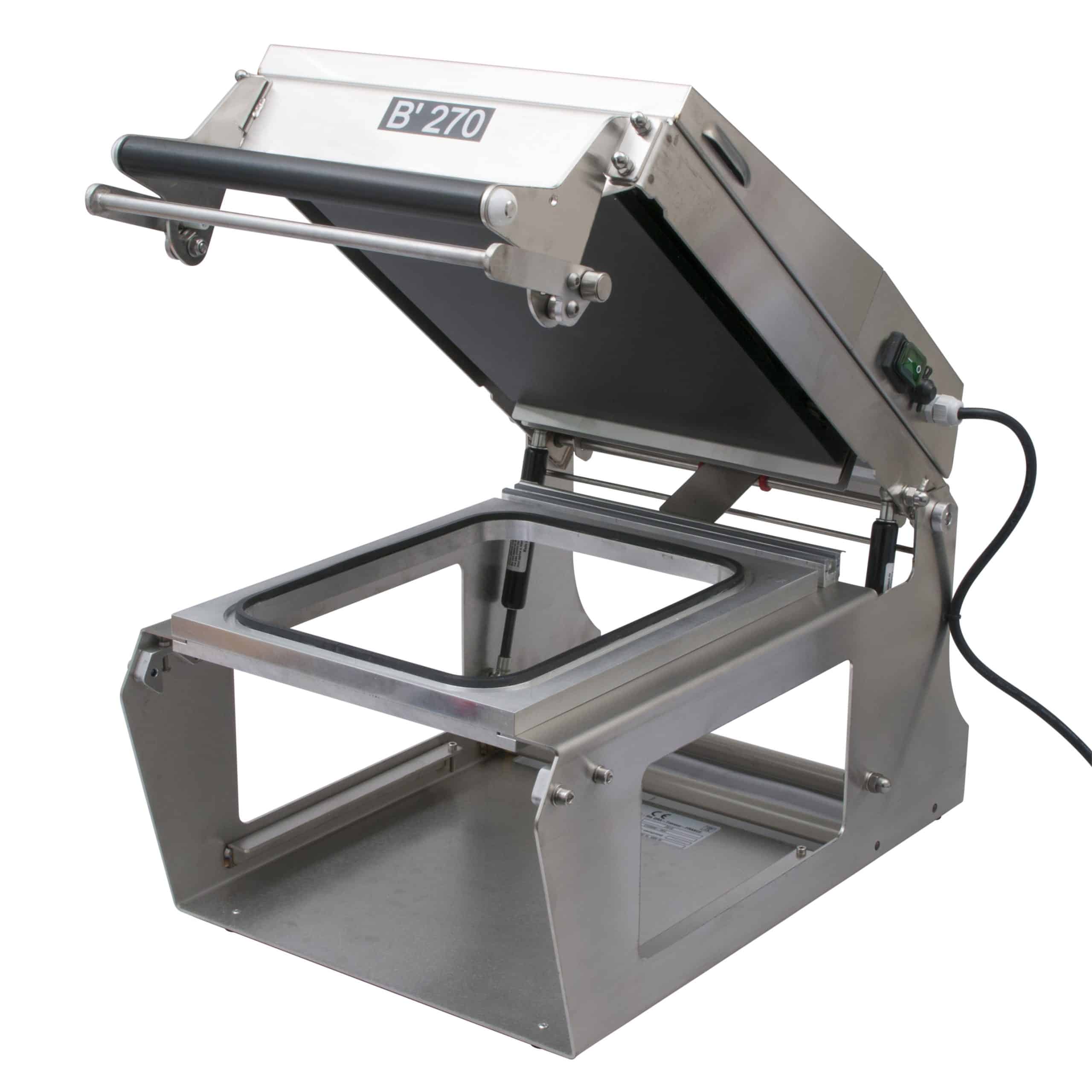 Our BARQ270 tray sealing machine seals tray varieties up to 270 x 345mm and in one simple action trims the film across the back providing a hermetically sealed tray. This machine will seal ten trays per minute, has a digital temperature control and the all stainless steel design is easily wiped clean after use with a damp cloth.